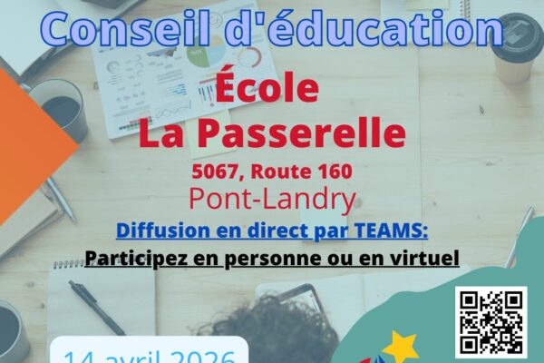 Le Conseil d’éducation du DSFNE convie le public à sa réunion publique le mardi 14 avril à 19h00 à l’École La Passerelle de Pont-Landry. Cette rencontre sera aussi diffusée en direct par TEAMS. Pour participer veuillez cliquer ici.