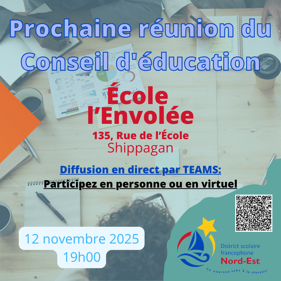 Le Conseil d’éducation du DSFNE convie le public à sa réunion publique le mercredi 12 novembre à 19h00 à l’École l’Envolée de Shippagan. Cette rencontre sera aussi diffusée en direct par TEAMS. Pour participer veuillez cliquer ici.