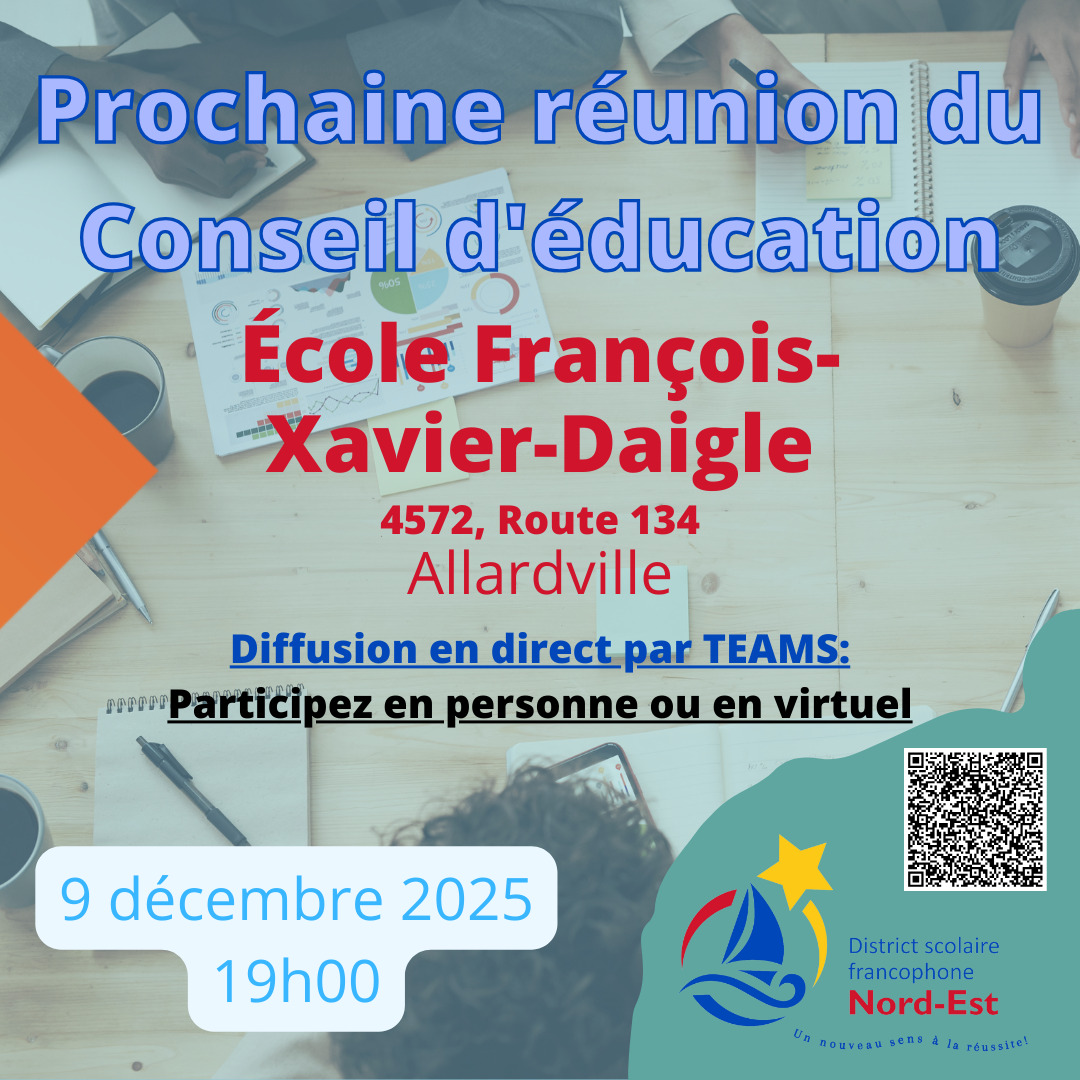 Le Conseil d’éducation du DSFNE convie le public à sa réunion publique le mardi 9 décembre à 19h00 à l’École François-Xavier-Daigle d’Allardville. Cette rencontre sera aussi diffusée en direct par TEAMS. Pour participer veuillez cliquer ici.